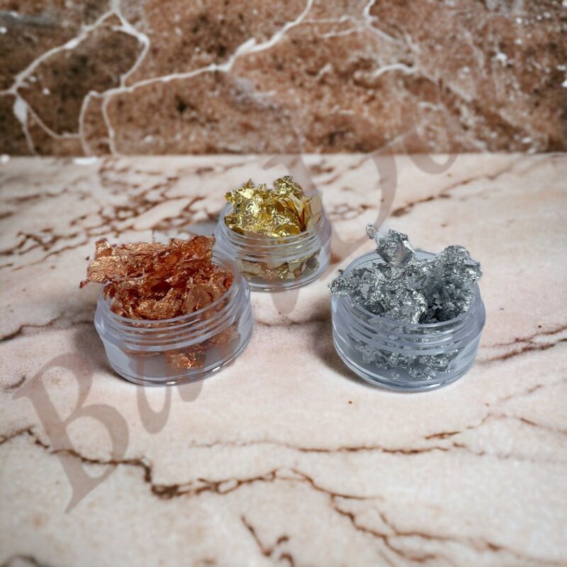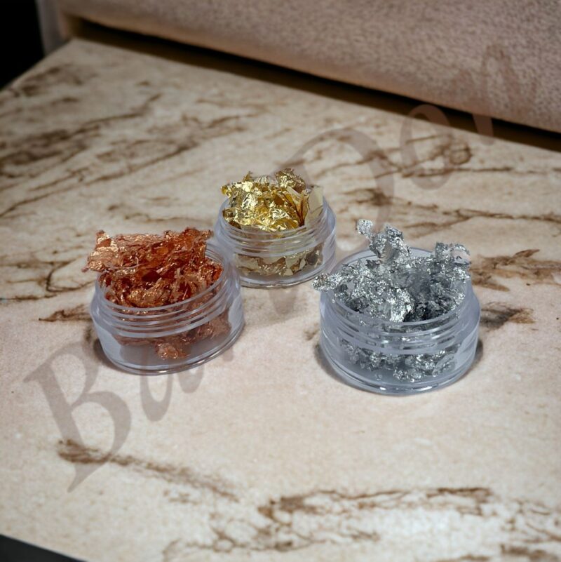 Τα φύλλα Gold-Silver-Rose Gold μπορείτε να τα χρησιμοποιήσετε για διακόσμηση νυχιών, προσδίδοντας μια πολυτελή και λαμπερή όψη. Μπορείτε να εφαρμόσετε επάνω σε απλό ή ημιμόνιμο βερνίκι νυχιών για να δημιουργήσετε μοτίβα και σχέδια. Κόβω τα φύλλα σε μικρά κομμάτια και τα βάζω πάνω στο απλό βερνίκι ή στην κολλώδη του ημιμόνιμου. Τέλος βάζω τοπ και πολυμερίζω.
